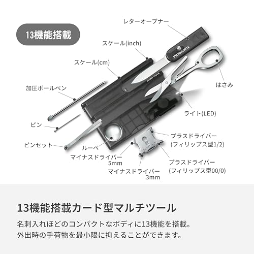 | 機能 | ナイフ、マイナスドライバー、缶切り、栓抜き、簡易のこぎり、ヒートンまわし、六角レンチ(6/7/8/10mm)、スケール、六角レンチ(4/5mm)、簡易方向読み、+キーホルダー用穴 |