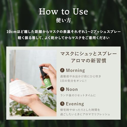 使用方法はスプレーをマスクの外側に向けて少し離して1~2プッシュするようです。アルコールを飛ばす必要があるので、着用の5~10分ほど前にスプレーしておくと良さそうです。